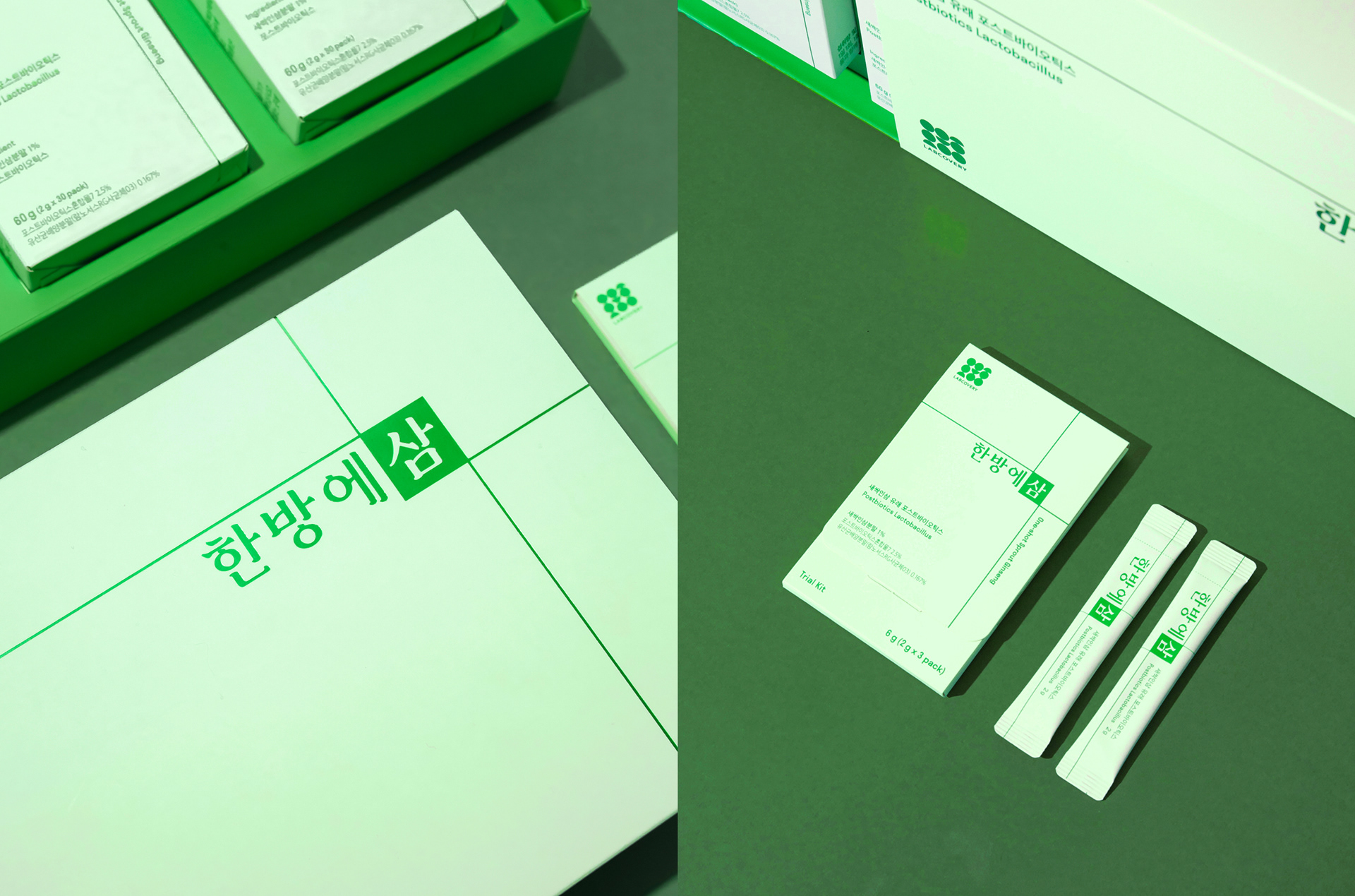 FROTN KIT developed the brand identity, master graphic, and package design of “Hanbangesam”, the probiotics product of “Labcovery” at “Rokya”. As the graphic motif, neat green line effect was used and emphasized to represent the ingredient, ginseng sprout and to express its rapid absorption inside the human body.